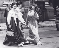 - Going Out portrays women dressed in fine traditional flower shoes and hanbok for outing. Judging from their looks, we can imagine the vibrant revitalization of Seoul. Unlike the men in the background dressed in Western suits, the women are dressed in full traditional Korean attire including jeogori and skirts, rubber shoes, and handbags. This scene symbolizes the resilience of Korean tradition that still survives to this day amidst the waves of modernization.
